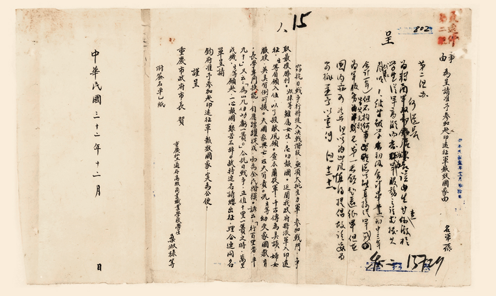 重庆记忆 渝档珍品 | 重庆私立适存高级商业职业学校学生桑淑棣等为参加赴印远征军报效国家呈重庆市市长的请缨书