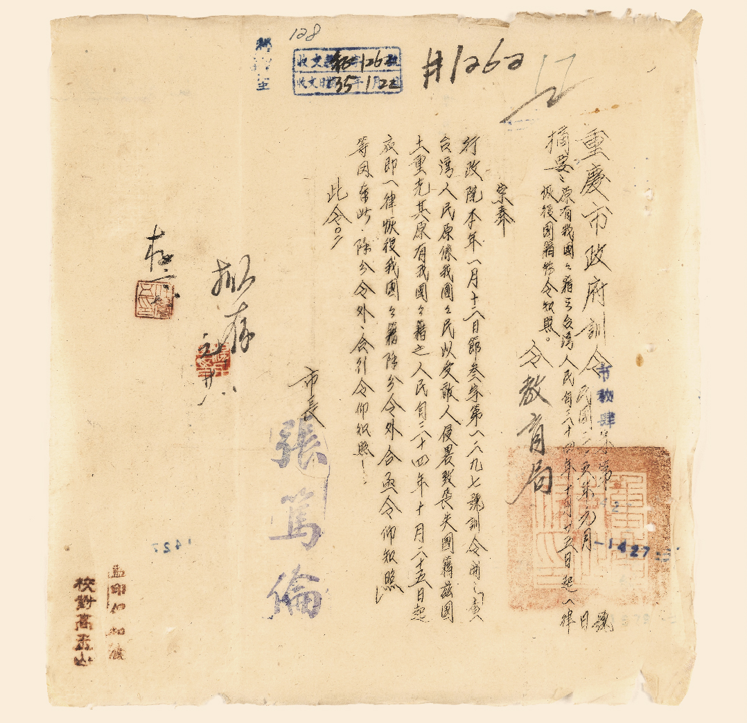 重庆记忆 渝档珍品 | 重庆市政府为奉行政院令知照原有我国国籍之台湾人民恢复国籍的训令