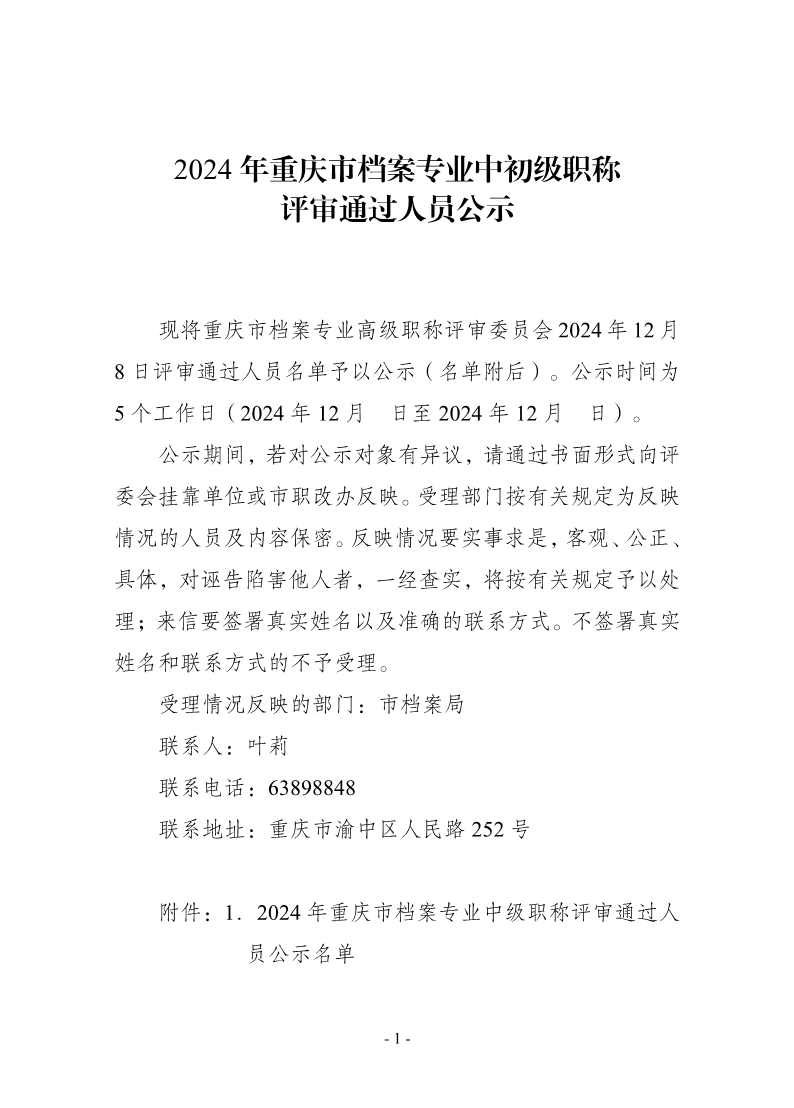 2024年重庆市档案专业中初级职称评审通过人员公示