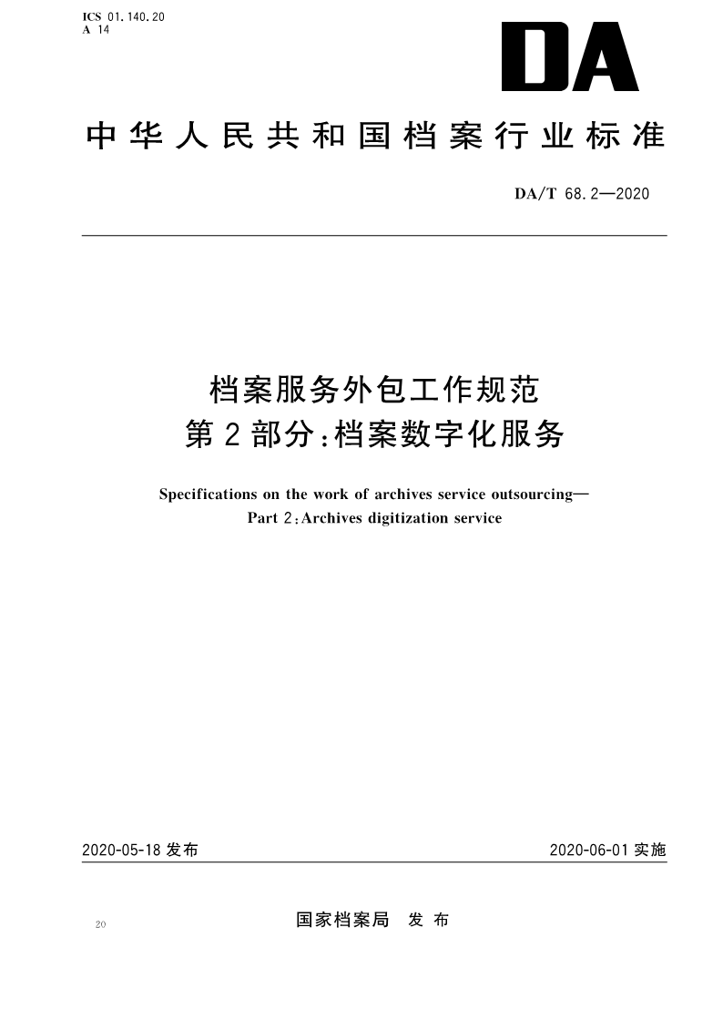 DAT 68.2-2020 档案服务外包工作规范 第2部分:档案数字化服务