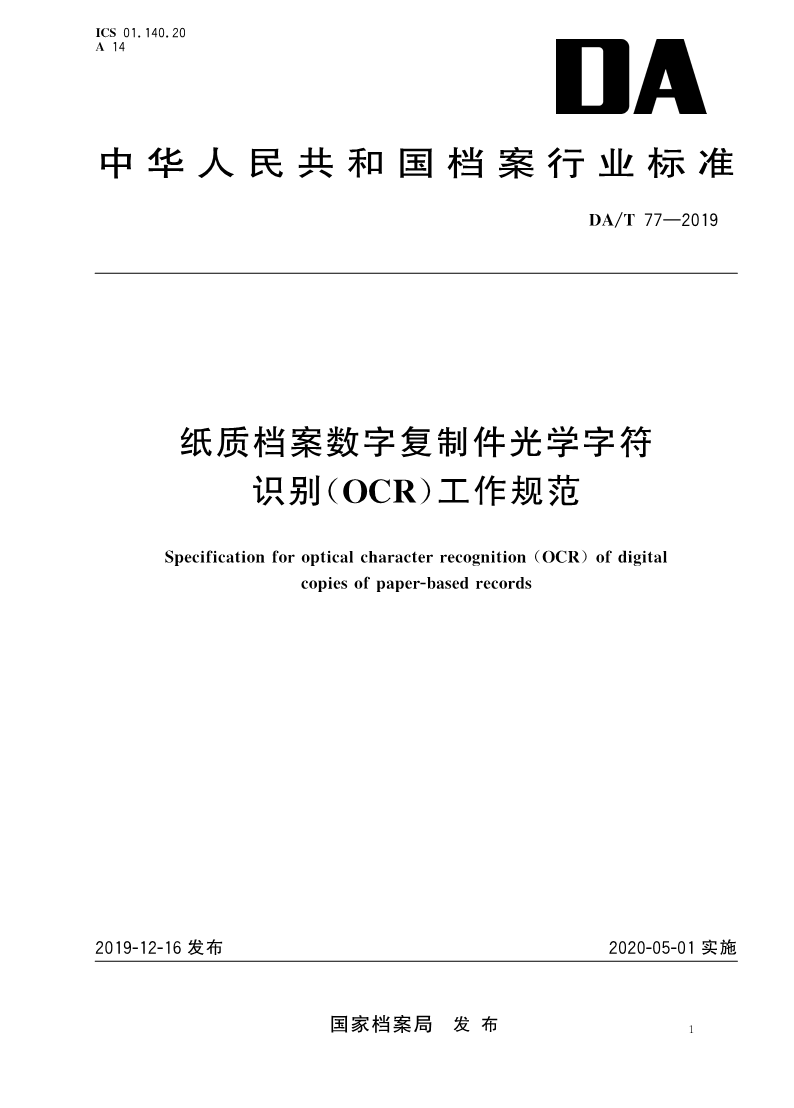 DAT 77-2019 纸质档案数字复制件光学字符识别(OCR)工作规范
