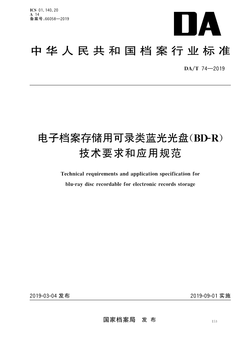 DAT 74—2019 电子档案存储用可录类蓝光光盘(BD-R)技术要求和应用规范