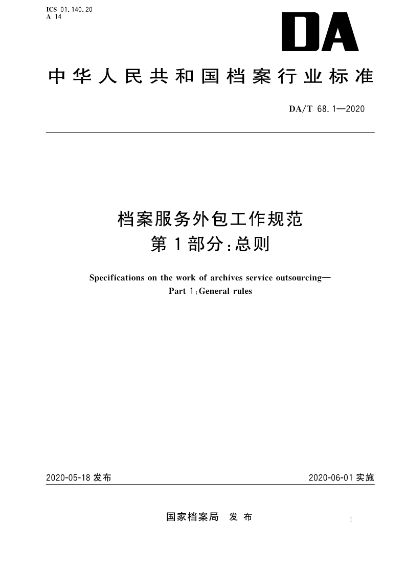DAT 68.1-2020 档案服务外包工作规范 第1部分:总则