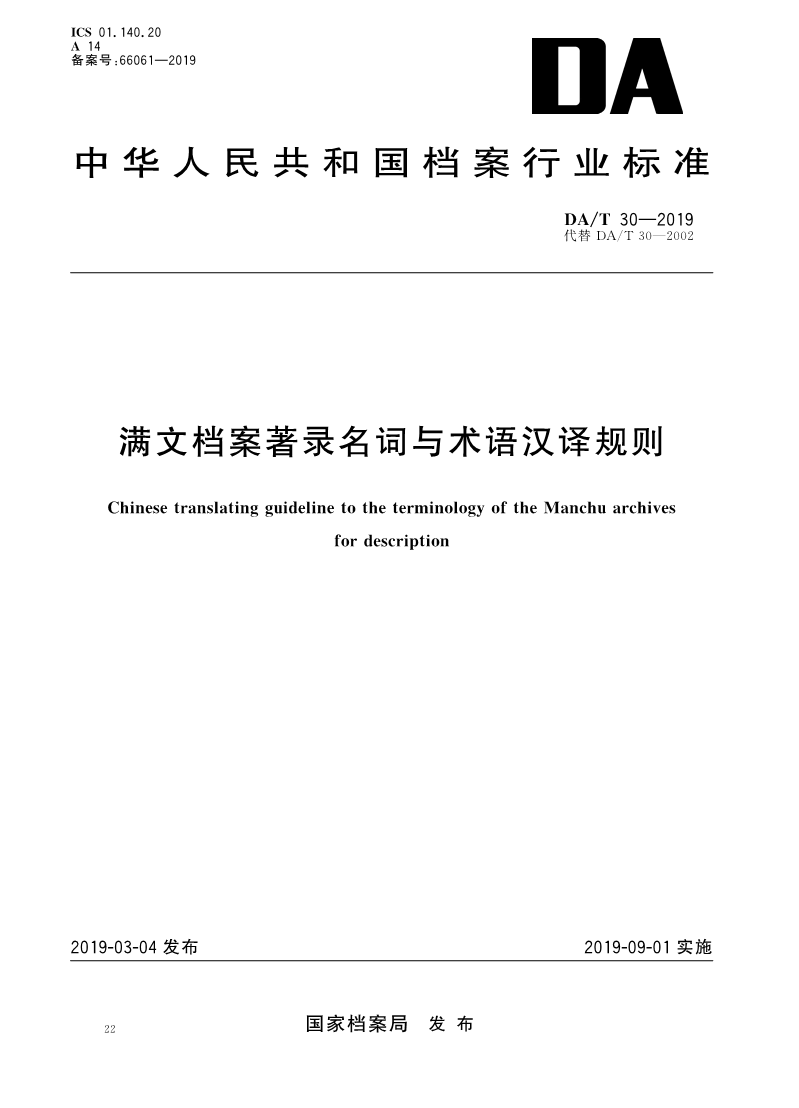 DAT 30—2019 满文档案著录名词与术语汉译规则