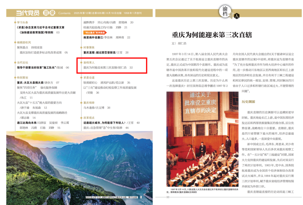 重庆直辖市的诞生,不仅是历史的必然选择,更是中国改革开放和现代化建设的重要成果。今天,站在新的历史起点,牢记习近平总书记的殷殷嘱托,3000多万巴渝儿女正立足新发展阶段,为奋力谱写中国式现代化重庆篇章而接续奋斗。