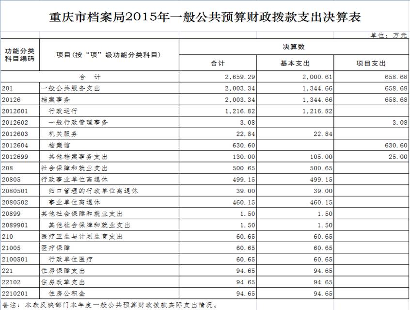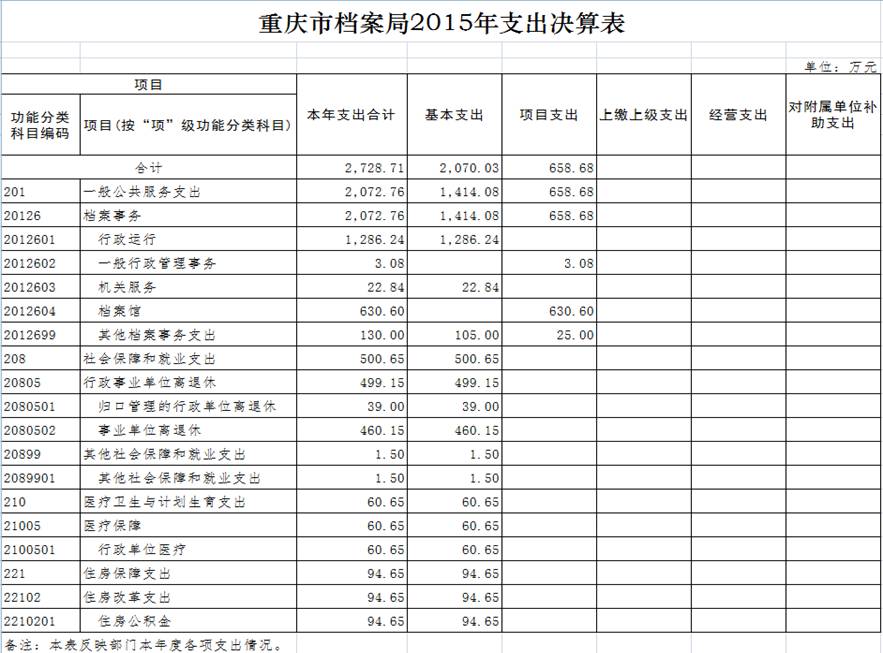 2015年决算支出2728.71万元,其中:基本支出2070.03万元,项目支出658.68万元。2014年支出2798.37万元,其中:基本支出1956.62万元,项目支出841.75万元。2015年决算支出比上年减少69.66万元,其中:基本支出比上年增加113.41万元,项目支出减少183.07万元。基本支出增加的主要原因是职工人数增加和津贴标准提高和公用经费增加所致,项目支出减少是因为三峡移民档案进馆项目减少所致。