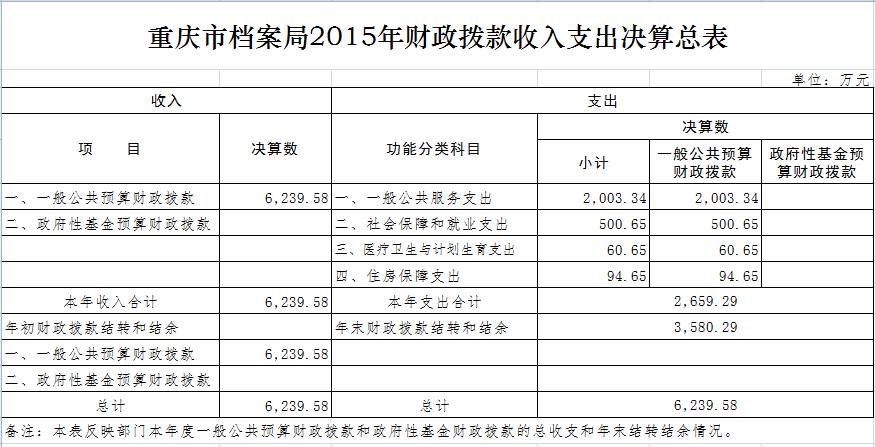 2015年决算收入6330.46万元,其中:财政拨款收入6239.58万元,其他收入90.88万元。2014年决算收入总额2962.4万元,其中:财政拨款2626.86万元,其他收入335.54万元;2015年决算收入比上年增加3368.06万元,财政拨款收入比上年增加3612.72万元,其他收入比上年减少244.66万元。财政拨款增加的主要原因是本年增加了档案馆新馆建设的基本建设拨款3575万元,其他收入减少的主要原因是三峡移民档案进馆资金减少所致。2015年年初部门预算收入2153.19万元,其中:财政拨款收入2091.19,其他收入62万元。决算收入比年初部门预算收入增加4177.27,财政拨款收入增加4148.39万元,其他收入增加28.88万元。财政拨款收入增加原因:一是基本支出追加拨款增加435.92万元,其中:在职职工人员拨款增加373.26万元,系在职职工工资、津贴及奖金增加和因增资所增加住房公积金所致,离退休支出拨款增加62.66万元,是因离退休人员的离退费增加所致;二是项目拨款增加3718.72万元,是因追加档案馆消防管道维修费37.22万元,上年结转的档案保护配套费70.5万元,国家重点档案抢救费36万元,档案馆基本建设拨款3575万元。其他收入增加28.88万元三峡移民档案进馆项目验收50万元、档案寄存费等其他收入比预算减少21.12万元。