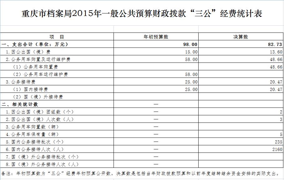 “三公”经费支出82.73万元比预算控制数98万元少15.27万元,其中:因公出国经费13.60万元比2014年的15.10万元下降1.5万元,比预算控制数15万元减少1.6万元,2015年因公出国2个团3人,比2014年出国7人少了4人,出国经费比2014年少1.5万元;公务用车运行及维护费48.66万元比2014年的78.09万元下降29.43万元,主要是2015年减少了一辆公务用车购置25.33万元,15年共有12辆公务用车,每辆车一年运行维护费4.06万元,公务用车运行维护费也节约了5.9万元,是我局加强了车辆管理,严格控制费用支出的结果,因此,达到了在车辆增加的基础上,比预算控制数58万元少9.34万元的效果:公务接待235次,2160人,人均公务接待费95元,公务接待费20.47万元比2014年的15.21万元增加5.26万元。主要是接待批次和人数分别比2014年的增加125批次和551人,在严格控制接待陪同人数的情况下,公务接待费比预算控制数25万元少4.53万元。
