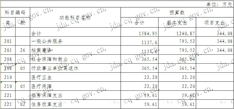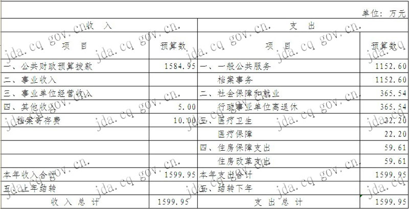 2013年收入预算1599.95万元,一般财政拨款1584.95万元,其他收入15万元,档案事业支出合计1599.95万元,档案事务基本支出 808.52万元,项目支出344.08万元,离退休支出365.54万元,医疗卫生支出22.20万元,住房改革支出59.61万元。