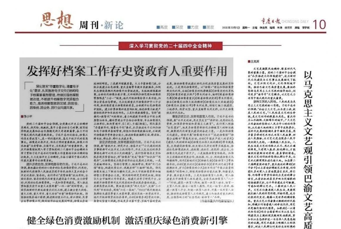 《重庆日报》刊发市档案馆馆长李小平署名文章:发挥好档案工作存史资政育人重要作用