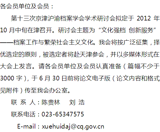 重庆市档案学会关于征集第十三次京津沪渝档案学会学术研讨会论文的通知